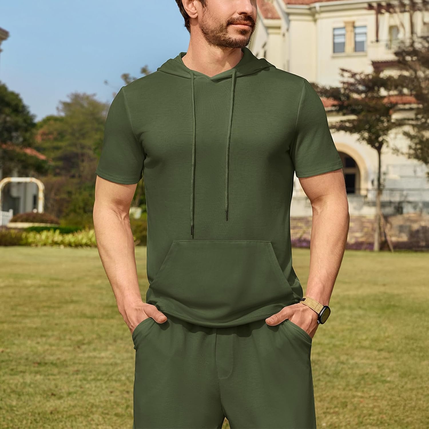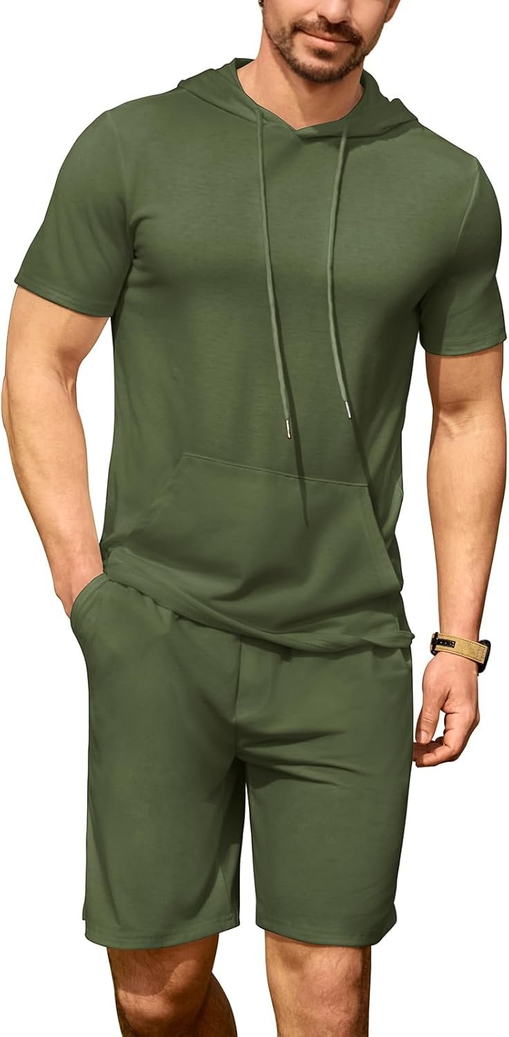 - INNOVATIVE DESIGN??This two-piece set includes a short-sleeve hoodie with a drawstring hood, allowing you to adjust the fit for added comfort. The shorts are equipped with convenient side pockets and an elastic waistband with an adjustable drawstring, offering both functionality and ease. The fabric??s breathability ensures you stay cool and stylish no matter what you??re doing.